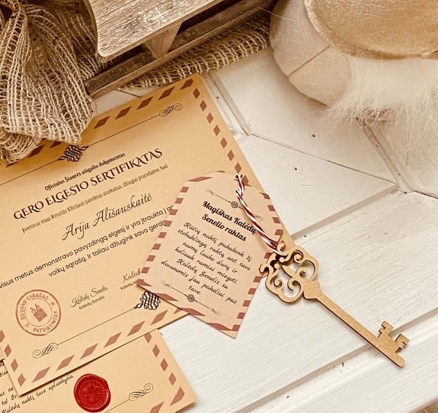 GERO ELGESIO SERTIFIKATAS. Pagal unikalų susitarimą su Elfų atstovybe, mums suteikta išskirtinė teisė naudotis Šiaurės ašigalio duomenų baze, todėl turime prieigą prie gerų vaikų sąrašo, pagal kurį esame įgalioti išduoti gero elgesio sertifikatus.