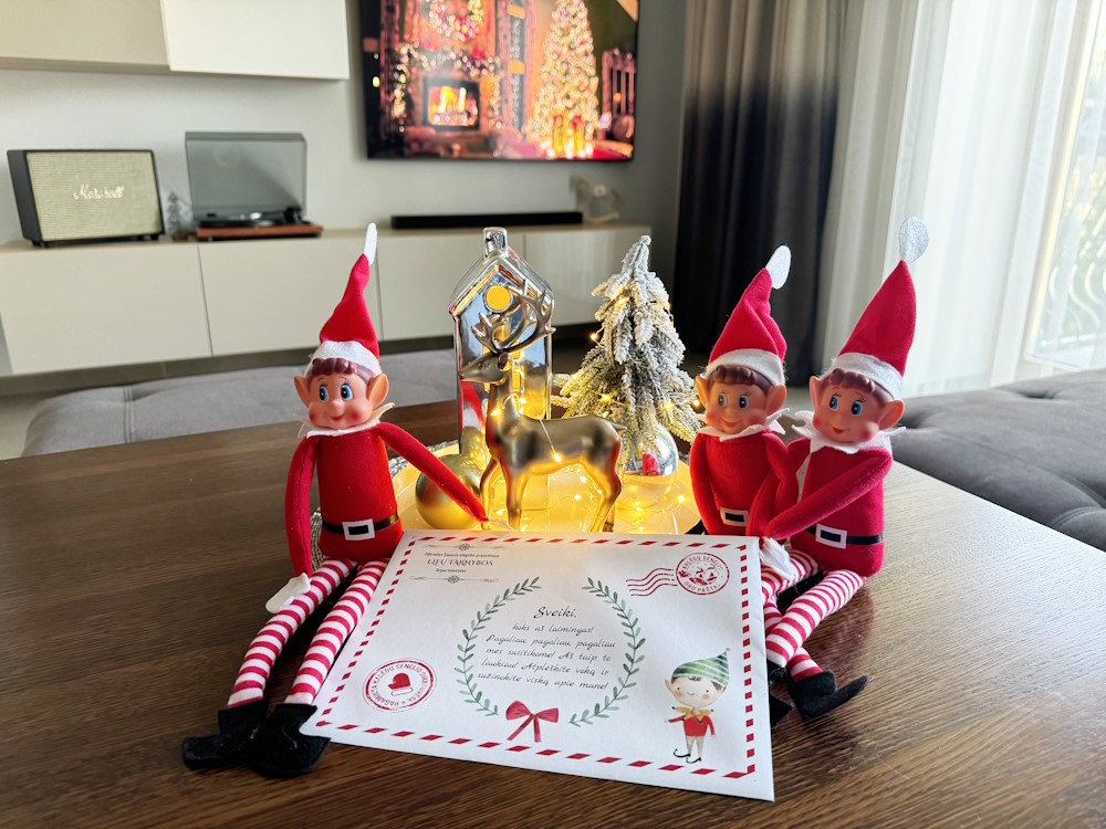 UŽDUOTIS TĖVELIAMS – papasakoti vaikams elfo istoriją, supažindinti su elfo taisyklėmis ir vakarais, vaikams sumigus, padėti elfą vis kitoje namų vietoje.